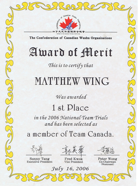 He has won numerous trophies at local and international tournaments over the years including 4 Grand Championships. He has consistently been a top senior forms competitor internationally. He is also a member of the BCSMAC Referees Association and Wushu BC. On October 2022, he won the Adult Black Belt Open Forms Grand Champion at the Western Canadian Martial Arts Championships at BCIT. In 2006, he received the Award of Merit and was awarded first place in the National Team Trials and selected as a member of Team Canada. He received a certificate from the WORLD ORGANIZATION OF WUSHU & KUNG FU MASTERS for Level 7 degree. In 2005, he also received a diploma from The Confederation of Canadian Wushu Organisations for Level 7, Master Degree. |
